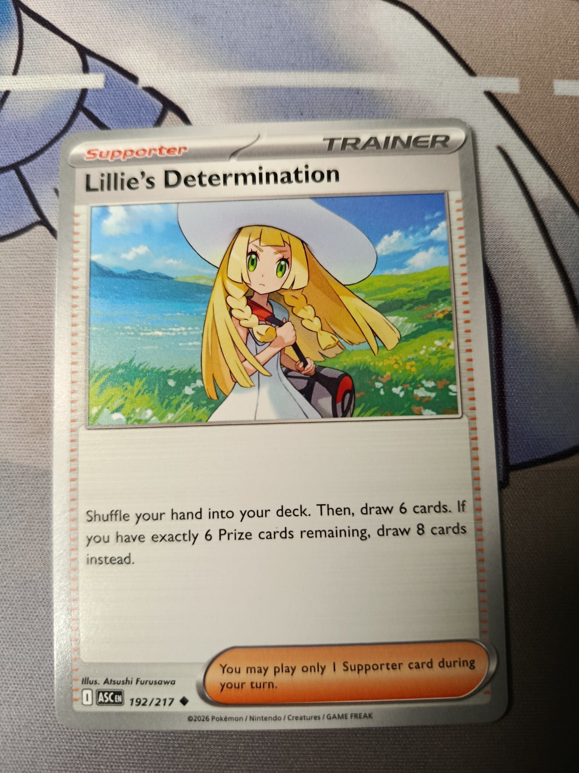 Card Text:Shuffle your hand into your deck. Then, draw 6 cards. If you have exactly 6 Prize cards remaining, draw 8 cards instead.