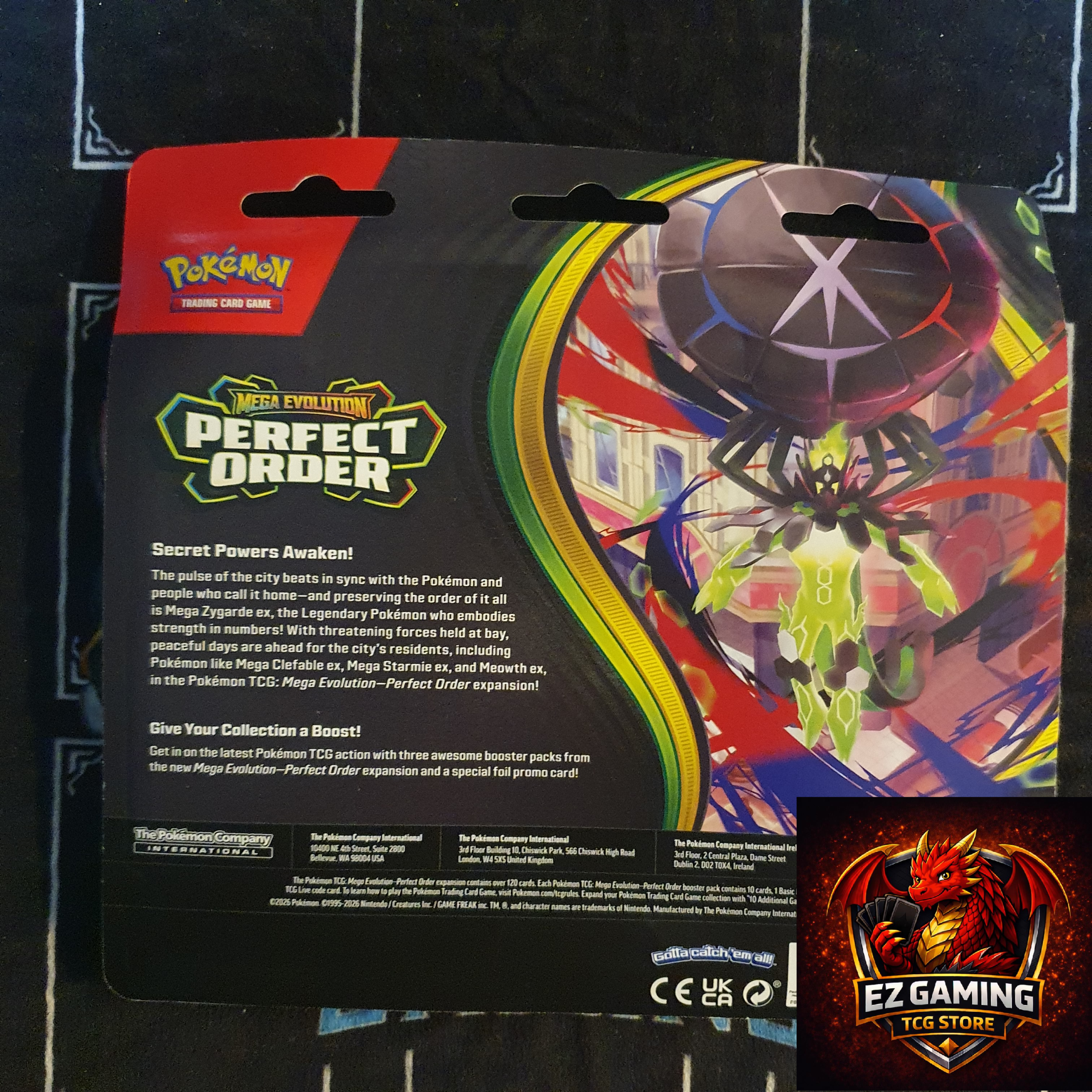 El pulso de la ciudad late al ritmo de los Pokémon y las personas que la habitan, y quien mantiene el orden es Mega Zygarde ex, el Pokémon legendario que personifica la fuerza de la unión. Con las fuerzas amenazantes a raya, se avecinan días de paz para los habitantes de la ciudad, incluyendo Pokémon como Mega Clefable ex, Mega Starmie ex y Meowth ex, en la expansión Pokémon TCG: Mega Evolution—Perfect Order.