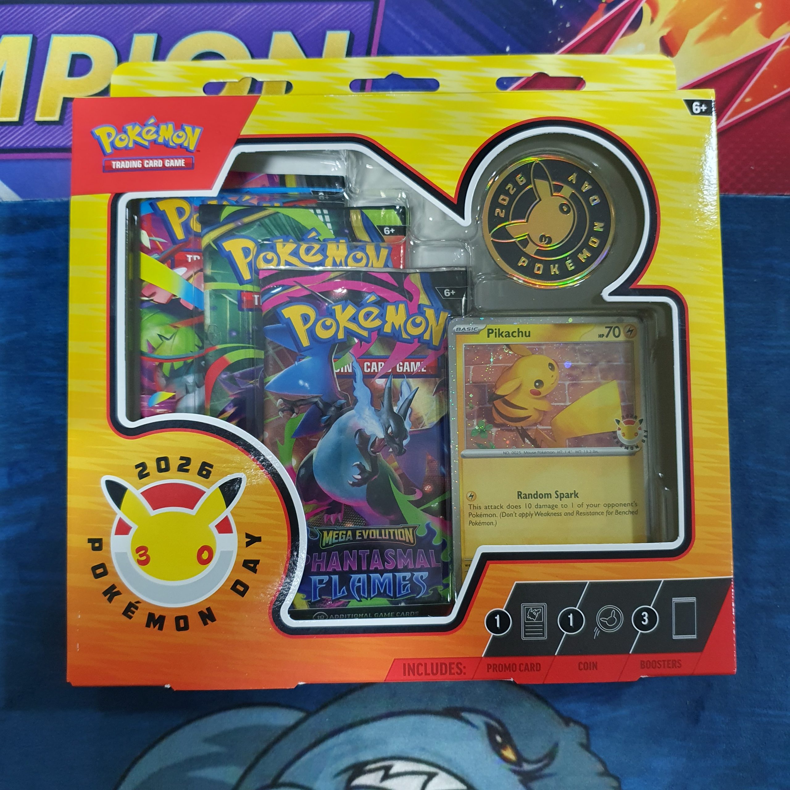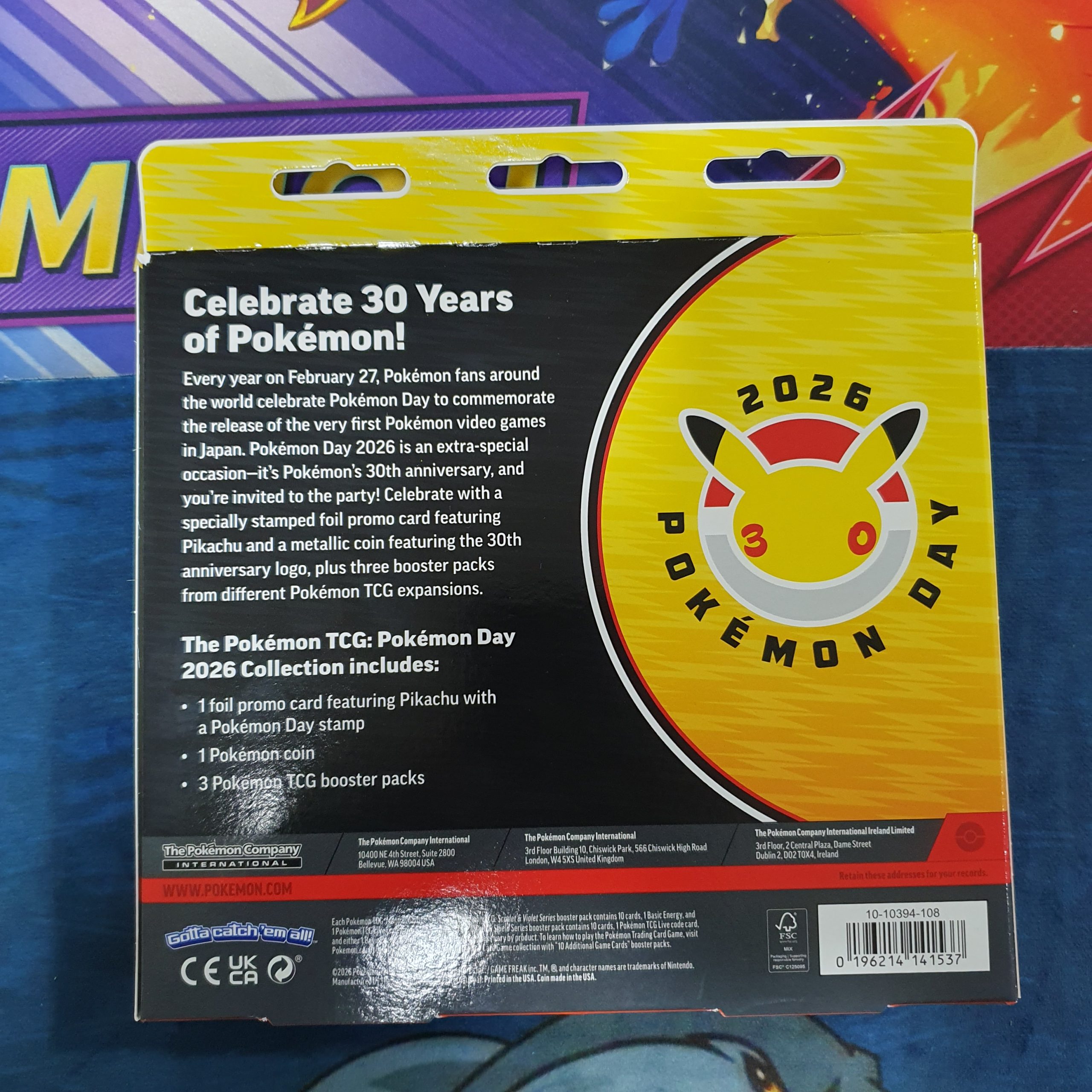 Cada año, el 27 de febrero, los fans de Pokémon de todo el mundo celebran el Día de Pokémon para conmemorar el lanzamiento de los primeros videojuegos de Pokémon en Japón. Puedes celebrar la ocasión con una tarjeta promocional holográfica conmemorativa de Pikachu y una moneda metálica con un logotipo especial, además de tres paquetes de refuerzo de diferentes expansiones del JCC Pokémon.